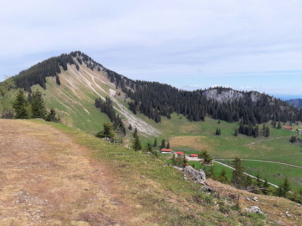 Vom Parkplatz geht man in etwa einer Stunde auf dem breiten Forstweg bis zur Unteren Firstalm. Hier widerstehen wir einer frühen Einkehr, gehen an der verlockenden Hütte vorbei und folgen dem Pfad in südwestlicher Richtung hinauf Richtung Rosskopf/Bodenschneid.