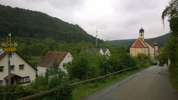Nach der Führung gehen wir den Weg zurück und biegen dann nach rechts ab auf dem Wanderweg Richtung Essing. Wir überqueren zwei Straßen und kommen an den Ortsanfang von Essing. Sobald die Kirche in Blick kommt, biegt an einem Wegweiser nach rechts ein kleiner Pfad ab nach Randeck (wer will kann auch schon früher nach der zweiten Straßenquerung nach rechts abzweigen).