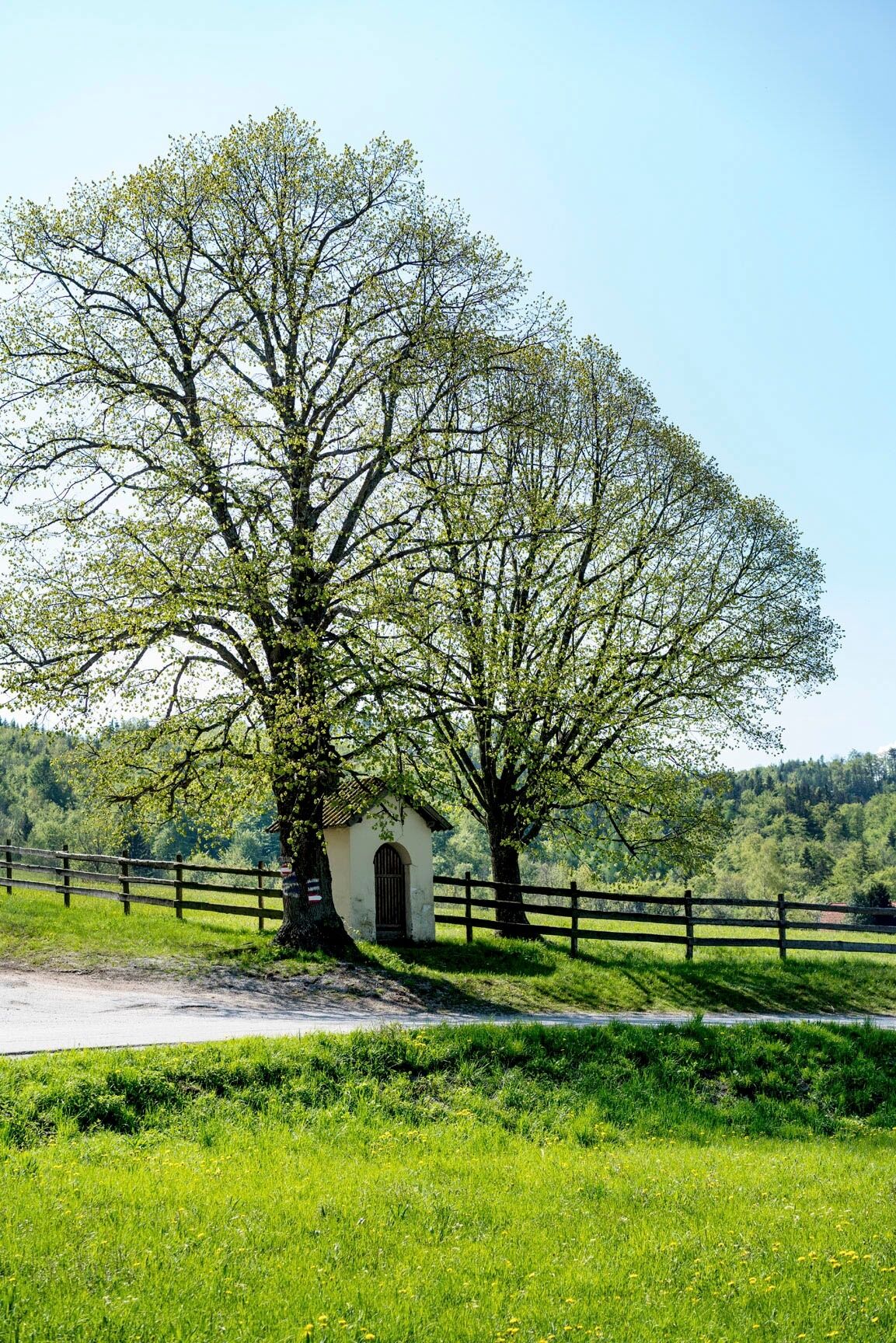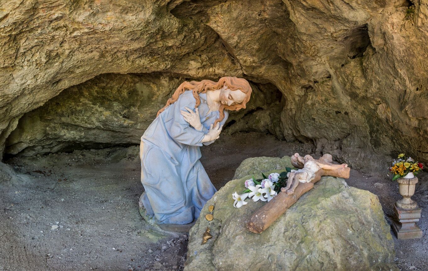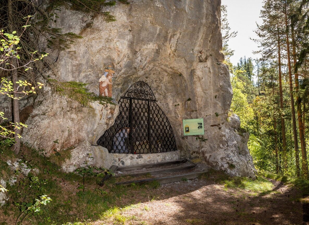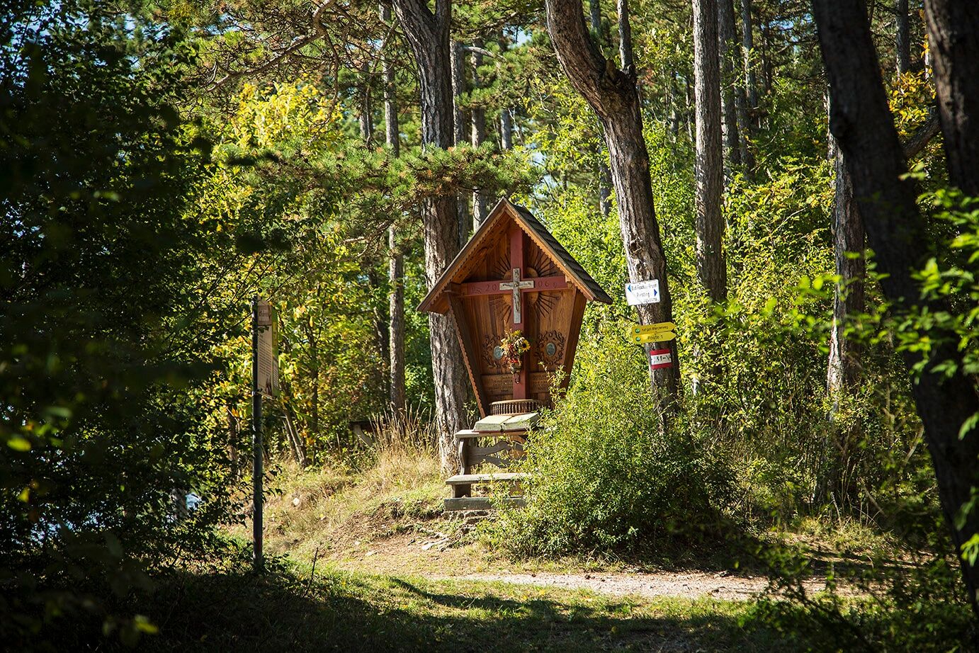 Tras un refrigerio en la Öhlerschutzhaus y una vista a través del mirador de los Alpes vieneses hacia el Mariahilfberg, descendemos ahora hacia Gutenstein por Öhlerkreuz (marcado en azul). En el descenso a la granja Öhlersimmerl nos acompañan unas maravillosas vistas de los Alpes de Gutenstein. Justo después de la granja Öhlersimmerl, nos desviamos por el sendero ligeramente por encima de la zanja, que nos lleva hacia el valle, siguiendo la carretera hacia el norte, pasando por la granja Brandstätterhof. Después de unos kilómetros, dejamos la carretera y giramos a la izquierda por el camino Schaftersbachweg hacia Mariahilfberg. Caminamos cuesta arriba por la carretera forestal durante unos minutos antes de girar a la derecha por el empinado sendero del prado frente a una casa unifamiliar. Seguimos el sendero cuesta arriba por un camino forestal hasta llegar a un cruce. Aquí giramos a la derecha hacia Mariahilfberg. Como alternativa, podemos descender unos metros hasta la Gruta de la Magdalena y caminar desde allí hasta el Mariahilfberg.
