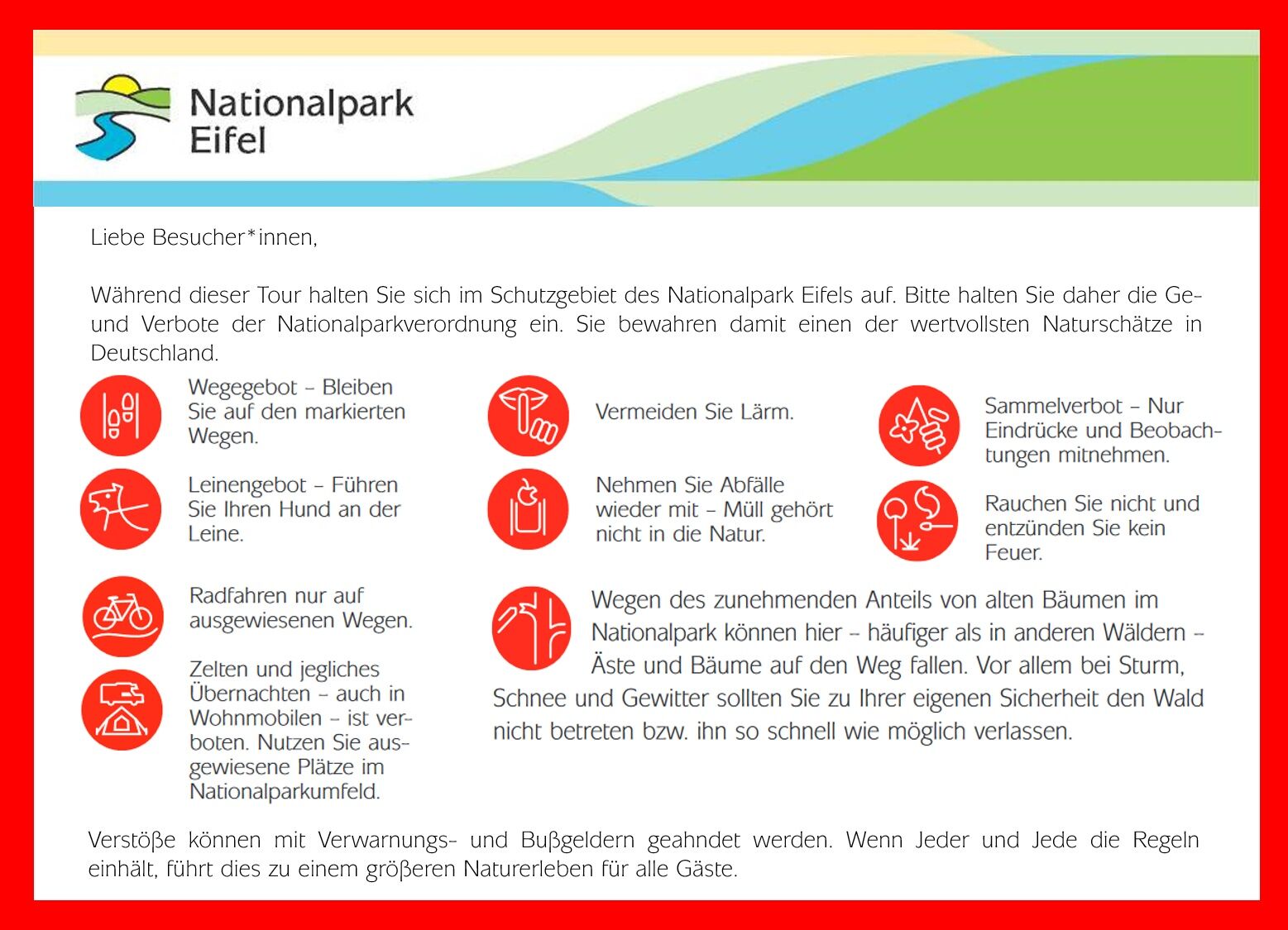 Wegen des zunehmenden Anteils von alten Bäumen im Nationalpark können hier – häufiger als in anderen Wäldern – Äste und Bäume auf den Weg fallen. Vor allem bei Sturm, Schnee und Gewitter solltest Du zu Deiner eigenen Sicherheit den Wald nicht betreten bzw. ihn so schnell wie möglich verlassen.
