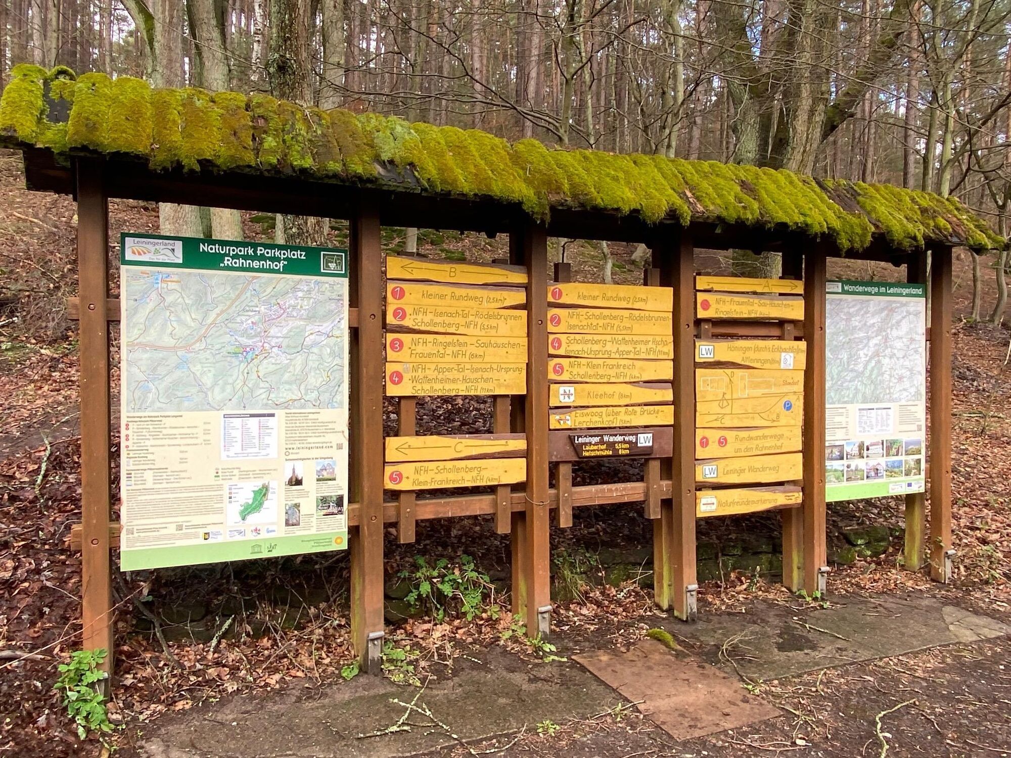 Wanderparkplatz im Wald beim Naturfreundehaus Rahnenhof Ausgangspunkt für den Premiumwanderwege Leininger Klosterweg (15,6 km), den Leininger Wanderweg (18,6 km) und verschiedener Rundwanderwege zwischen 2,5 und 9,5 km Länge Uneingeschränkte Parkdauer Kostenfreie Parkmöglichkeit Kein Wohnmobilstellplatz