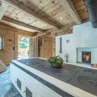 Im Erdgeschoß befindet sich ein großzügiger Wohn- und Essbereich mit komplett ausgestatteter Küche, gemütlicher Essecke, SAT-TV, Kachelofen und angrenzender Couch.