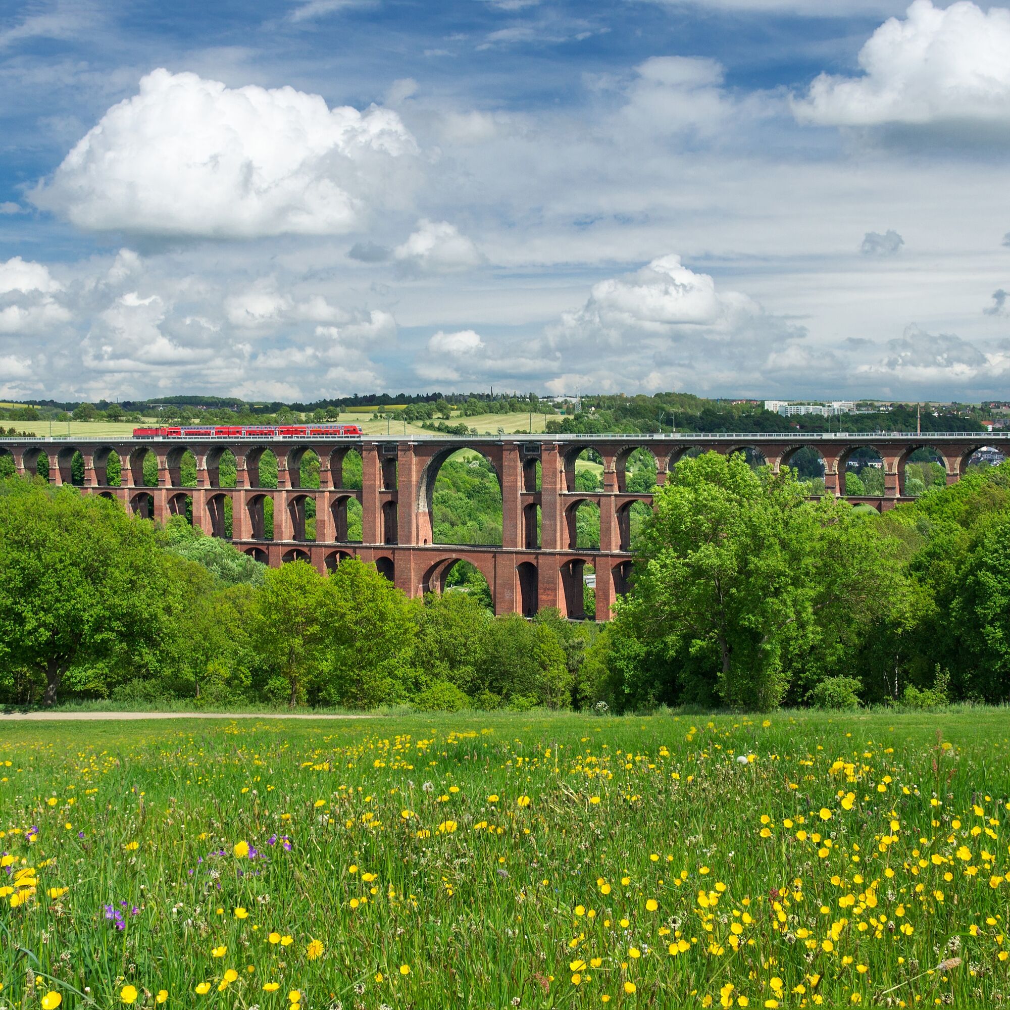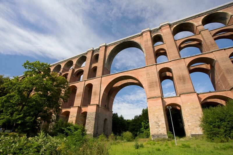 Wir verlassen den Markt in Richtung B173 und folgen dieser 600 m in Richtung Netzschkau bis zur Höhe des Metallbaubetriebes auf der rechten Straßenseite. Hier biegen wir nach rechts zum Karl-Marx-Ring ab. Bis dahin war der Untergrund mit Platten ausgelegt oder asphaltiert. Ab dem Abzweig haben wir einen schlechten Untergrund mit vielen Schlaglöchern. Nach 1,3 km befinden wir uns am Gelände rund um die Göltzschtalbrücke. Sie ist 78 m hoch, hat vier Etagen mit 98 Gewölben.