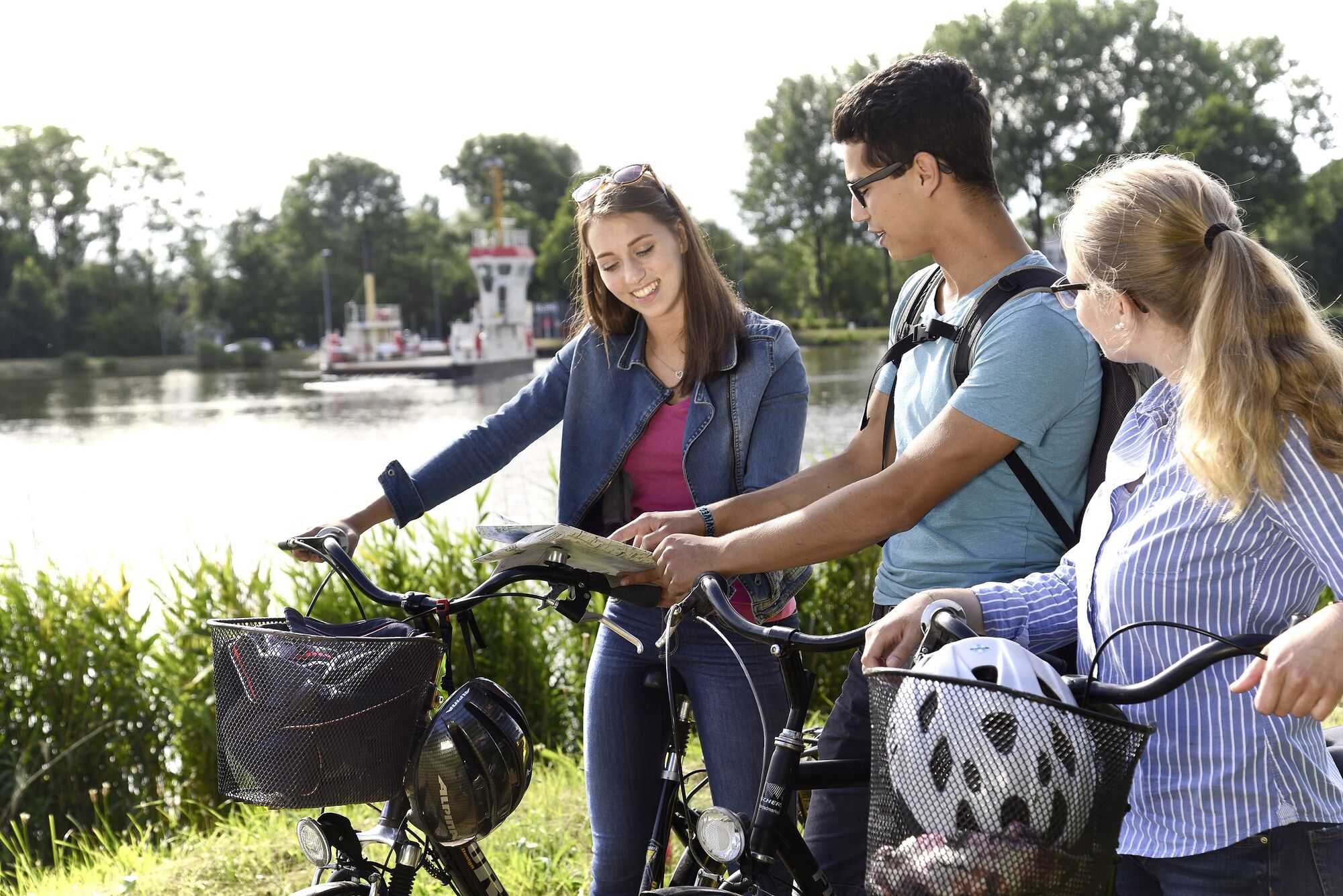 NOK-Route am Nord-Ostsee-Kanal entlang. Täglich bahnen sich 110 Schiffe auf der am meisten befahrenen Schifffahrtsstraße der Welt ihren Weg von der Nordsee zur Ostsee. Vorbei an Flüssen und Seen, fahren Luxusliner und andere "Hochseepötte" durch Wald- und Wiesenlandschaften. Die 10 Brücken, 14 Fähren, imposanten Schleusenanlagen und Tunnel verleihen der Route ihren besonderen Charme. Die Kanalfähren können kostenlos benutzt werden.