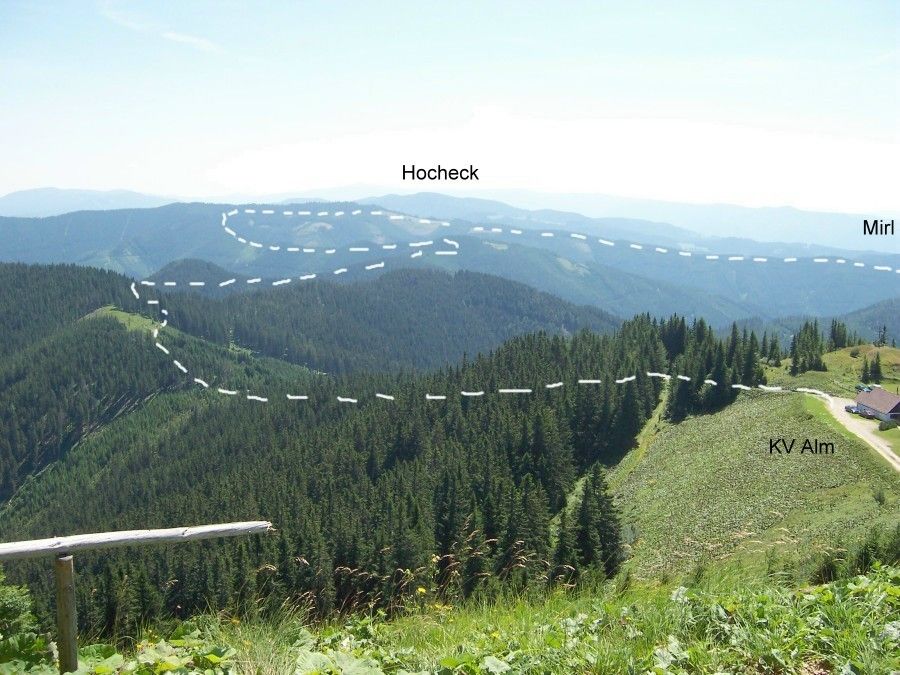 Von der Pfarrkirche in Dorf Veitsch Richtung Süden nach Niederaigen, rechts am Hochhaus vorbei bis zum Bauernhof Karner, hinauf zum Hochreiter. Vom Hochreiter auf den Hochreiterkogel und dann nördlich...
