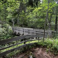 Weiter geht es über die sehr stabile Holzbrücke und wieder bergauf. Bei den aktuellen Temeperaturen (Juni 2025) ein schön schattiger Weg. Nach gut 1 bis 1,5 km teilt sich der Weg weiter geradeaus nach Scharnitz und links hinauf zur Pleisenhütte.