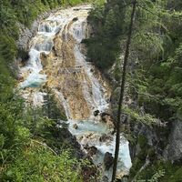 Nach gut 1,5 kommt das Hinweisschild rechts hinab zum Karwendelsteg. Dieser Weg ist wieder schmal und mit Wurzeln / Steinen und etwas Geröll versetzt. Nach ein paar Minuten ist bereits das Rauschen des Karwendelwasserfalls zu hören. Hier lohnt definitiv ein kurzer Stopp / eine kleine Rast, das Naturschauspiel zu betrachten.