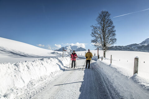 Take the same way back until the crossing "Stöcklweg". Don't cross the main road there! Go left until "Mühlau", follow the signs "Winterwanderweg" and turn right. Go along the "Schredergasse" until the big right turn and follow the signs "Winterwanderweg" again. At the end of the winter walking path take the underpass to cross the main road and go along the "Hintergasse" back to the center of Waidring.