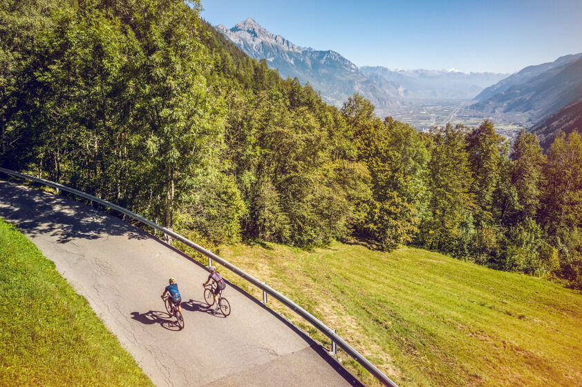La ruta comienza en el monolito rojo de la señalización de las rutas ciclistas del Valais en la Place Centrale en Martigny-Croix. Recorre las estrechas calles de la ciudad y luego cruza el puente sobre la carretera hacia el Gran San Bernardo. Subes por los viñedos, atraviesas las aldeas de Les Rappes y La Fontaine y llegas a la Route de la Forclaz. La subida se vuelve cada vez más empinada. Con muchas curvas y una pendiente media del 11 % y en algunos tramos del 14 %, tus pantorrillas pronto arderán intensamente. Después de unos cuatro kilómetros sudando y 400 metros de desnivel, finalmente alcanzarás la carretera principal de La Forclaz, donde puedes continuar tu ascenso hacia el Col de la Forclaz y quizás hasta la presa de Emosson, o bajar por la carretera principal hacia Martigny.