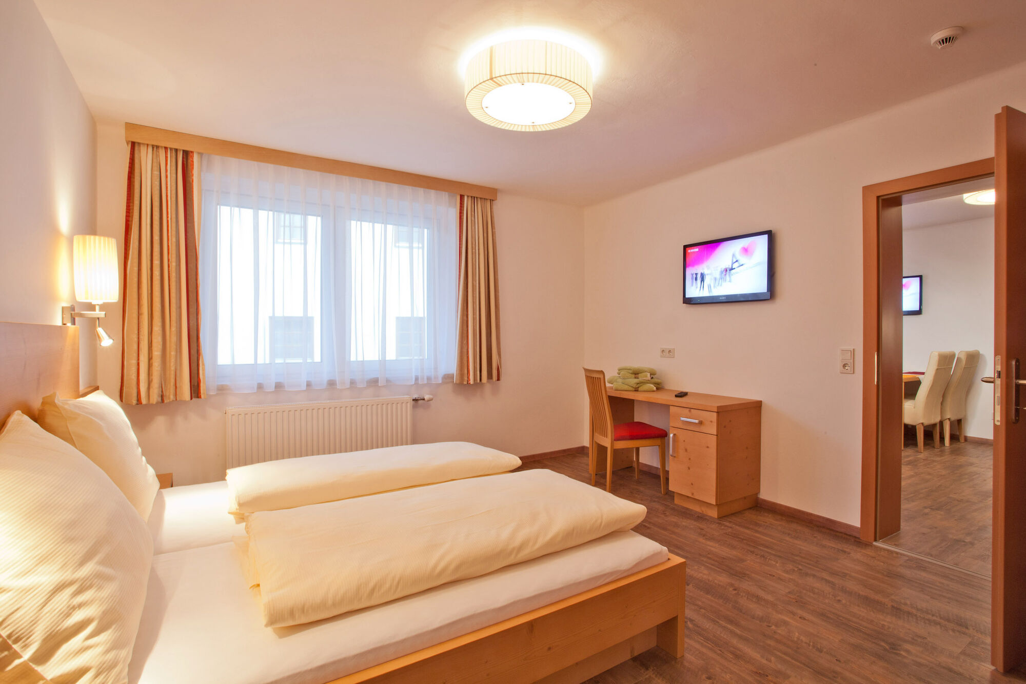 Bad mit Dusche und Handtuchtrockner, WC separat. Vorraum mit Garderobe. Flachbildschirm mit digitalem Kabel-TV-Anschluß in jedem Zimmer.